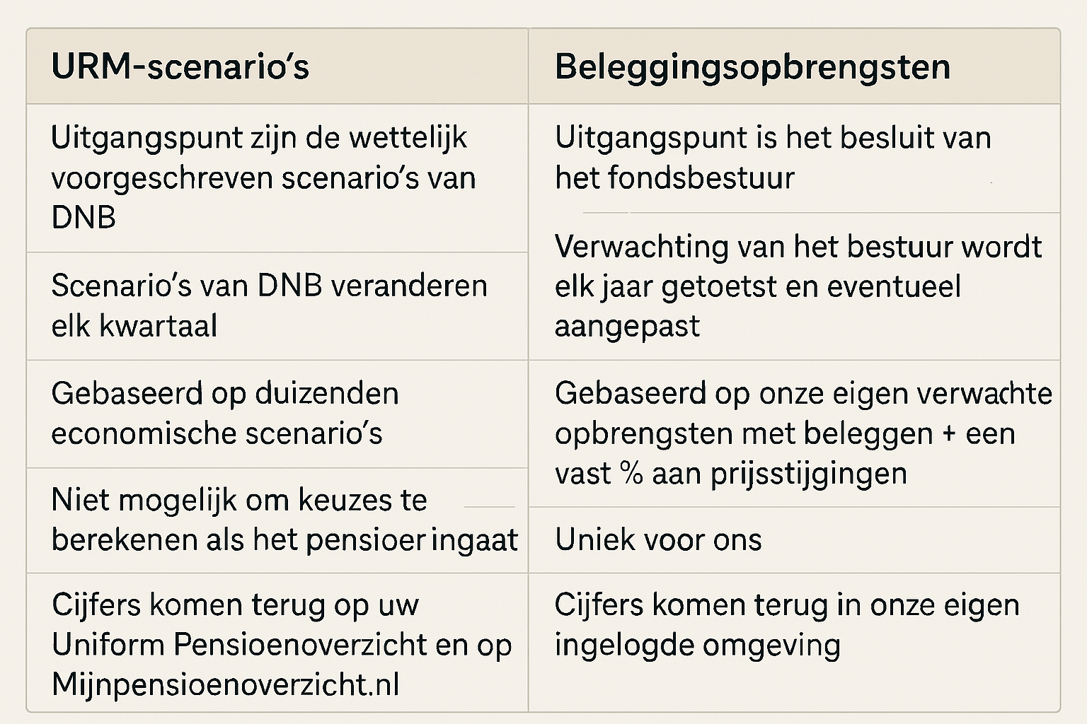 De reden heeft te maken met de doorrekening van de keuzes die u kunt maken als u met pensioen gaat. U kunt kiezen om bijvoorbeeld eerder, in deeltijd of later met pensioen te gaan. Of om meer pensioen voor uzelf of voor uw partner te regelen. Deze keuzes hebben invloed op hoeveel pensioen u krijgt. Dat kunt u uitrekenen met de pensioenplanner nadat u inlogt. We willen u graag een zo realistisch mogelijk beeld geven van wat uw keuzes betekenen. Deze berekeningen kunnen wij niet maken met de duizenden URM-scenario’s van DNB.